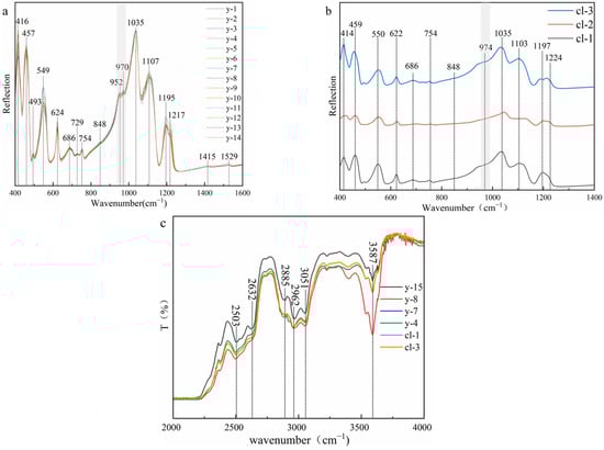 (a) Infrared spectra (reflection) of yellow samples; (b) infrared spectra (reflection) of colorless samples; (c) infrared spectra (transmission) of scapolites.