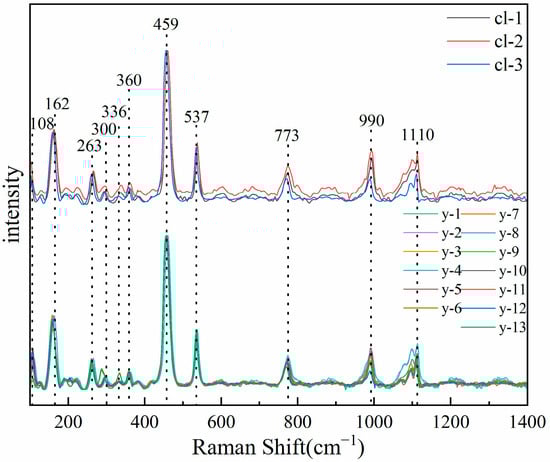 There are eleven obvious absorption peaks in the range of 100–1500 cm−1, including two strong absorption peaks, six moderate absorption peaks, and three weak absorption peaks. Predecessors have carried out a lot of research on the Raman spectra of silicate minerals. You et al. found that the Raman peaks below 400 cm−1 corresponded to the vibration of M-O and the lattice vibration mode between lattice skeletons [26].