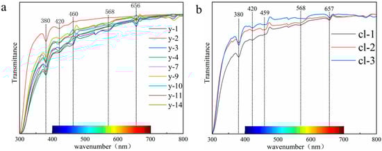 (a) UV-Vis spectra of yellow scapolites; (b) UV-Vis spectra of colorless scapolites.