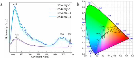 Different from the orange fluorescence found by previous scholars, the yellow and colorless Scapolite studied in this paper showed blue fluorescence. The excitation spectra of colorless and yellow scapolite collected under 254 nm and 365 nm excitation light sources are shown in Figure 9a, and the image of their color coordinates on CIE1931 is shown in Figure 9b. The results showed that colorless and yellow scapolite fluoresced blue under both long-wave UV and short-wave UV, but the fluorescence intensity of scapolite is much stronger under 254 nm excitation, which is intuitively manifested by the more intense blue fluorescence of the colorless sample. In the short-wave region, scapolite has a broad strong excitation peak centered at 410 nm, which is the reason for its blue fluorescence. The experimental results of ICP-MS of y-5 and cl-3 samples (shown in Table S3 in the supporting document) show that scapolite samples contain rare earth elements Ce, Eu, La, Lu, Nd, Th, Tm, Y, and Yb. Obviously, the strong excitation at 410 nm is produced by 4f1 → 5d1 of Ce3+ [39], which is the reason for the blue fluorescence of the scapolite. The excitation in the range of 450–500 nm is produced by other rare earth elements in the scapolite. In the red region, there is a very obvious strong excitation band in scapolite, which shows broadband centered at 690 nm under the excitation of 365 nm, and a narrow excitation peak centered at 738 nm under the excitation of 254 nm. This is mainly caused by the presence of (S2)− dimer in scapolite, which is also the reason why scapolite exhibits orange fluorescence [15,16]. However, it is obvious that the excitation of the blue region is much stronger than that of the red region in the scapolite, so the scapolite still exhibits blue fluorescence as a whole. In summary, scapolite has two very strong excitation centers both in the short-wave and long-wave UV. The rare earth elements make scapolite appear blue in fluorescence, in which Ce3+ plays a dominant role.