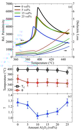 Relative permittivity and dielectric loss between 360 °C and 450 °C for NKN with specific vol% Al2O3 (a). Shift of Curie point and Curie–Weiss temperature (b) and measured exponent γ in Equation (7) (c) of NKN as a function of vol% Al2O3.