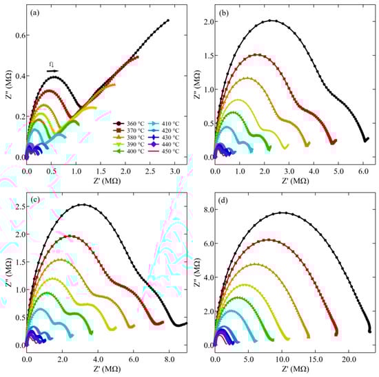 Figure 2 shows the frequency-dependent imaginary versus real part of the impedance (Nyquist plots) of the prepared composites with different Al2O3 contents as a function of temperature. All samples exhibit two semicircles that refer to the high- and intermediate-frequency-associated bulk and grain boundary impedance, respectively [,], where the low-frequency tail feature of the impedance spectra appears due to the electrode/material interface. As the temperature increases, the radius of the two semicircles decreases, which is likely due to an increase in the overall conductivity. Between 410 °C and 420 °C, the temperature range at which NKN transitions from a ferroelectric tetragonal phase into a paraelectric cubic phase, a significant decrease in real and imaginary impedance occurred. With increasing amounts of Al2O3, the response evolves into a single semi-circle due to the superimposed bulk and grain boundary contributions. Furthermore, it should be noted that the range of the y-axis, as well as the x-axis, is adjusted for different Al2O3 contents to improve visibility. As such, when comparing the different compositions, an increase in the real and imaginary impedance with increasing vol% Al2O3 is apparent. Similar to what has been observed in Pb0.925La0.05 (Zr0.53Ti0.47)O3−δ with variable fractions of Al2O3 [], the change could be due to an increase in the resistivity of the bulk response with increasing content.