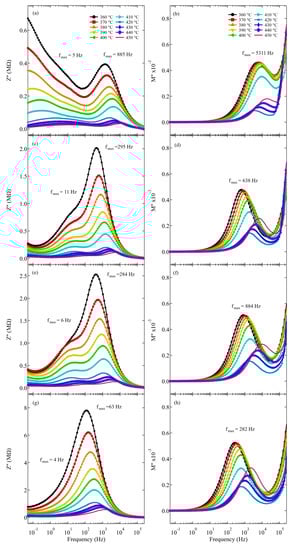 To further confirm this, the electric modulus was calculated, since changes in the modulus suggest possible changes in capacitance, whereas changes in the impedance are based on changes in resistance []. The electric modulus was calculated from Equations (4) and (5). From the values of , the imaginary part was determined. Maxima were clearly observed to be similar to the peaks in the impedance representing dielectric relaxation processes, albeit at different frequencies. In the ideal Debye-type relaxation process, the two peaks should coincide at the same frequency []. The large full width at half maximum and the asymmetrical shape of the peaks also suggest non-Debye behavior []. Similar to the observations on the relaxation peaks of the impedance, the maxima shifted to the higher frequency range with an increase in temperature, further confirming that the relaxation process is a thermally activated process. In addition, the value decreases with temperature until reaching the Curie point. Afterward, the peak increases in value with increasing temperature. The peak maxima are related to the relative permittivity as follows: