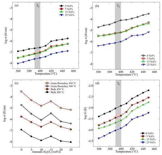 Conductivity of NKN as a function of temperature for bulk (a) and grain boundary (b), together with the overall conductance G (d) at selected vol% Al2O3. Gray area shows the phase transition region, which was estimated from permittivity–temperature data. Furthermore, bulk and grain boundary conductivities at 360 °C and 450 °C are shown as a function of Al2O3 content (c).