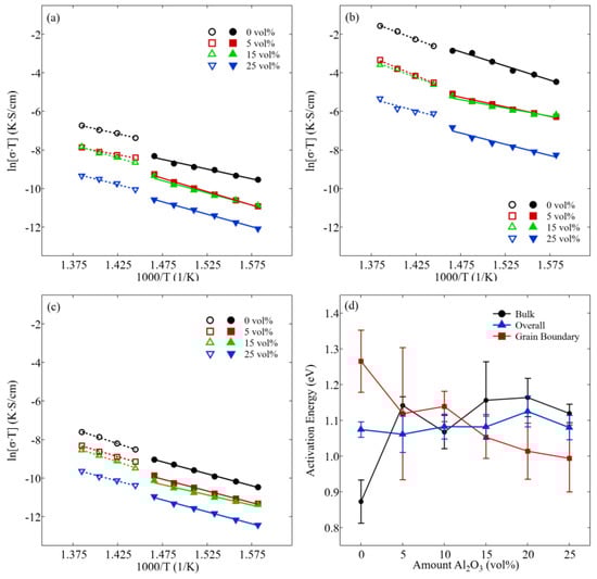 Arrhenius plots of the conductivity for various composites with varying amounts of Al2O3 for bulk (a), grain boundary (b), and overall conductivity (c). The activation energies are shown for bulk, grain boundary, and overall in (d). Error bars were calculated from the standard deviation given during the fitting process.