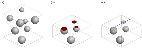 where and is the total number of particle cross-sections found on the plane. The term is the probability that the plane intercepts a particle at the location within the distance between h and . Thus, the probability is given by , and is a small increment of h described in Figure 2b. This allows Equation (8) to be expressed as