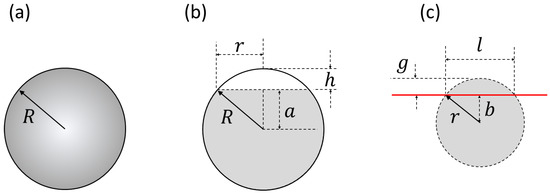 The definitions used to define the geometry in 3D, 2D, and 1D are shown in Figure 2. The radius of the particle in 3D is given by R. The radius of a cross-section of a spherical particle is given by r, where a length of h has been removed, leaving a distance a between the cut surface and the particle centre. Figure 2c shows a line intercepting a particle with a length of is present within the particle cross-section.