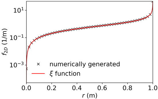 The functions shown in Equation (15) consider the cross-sections of a single size of particle. Figure 3 compares the analytical function to numerically generated data considering a particle with a radius of 1m. The numerical solution is obtained by using a pseudo-random number generator to take cross-sections or intersections through the particle, binning the radius of the cut into a histogram, and then converting the histogram into a probability density.