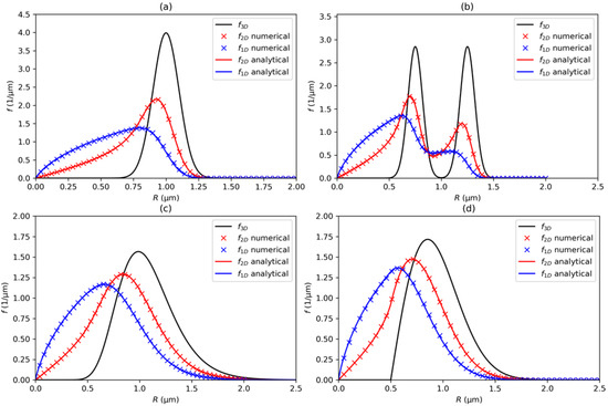 Comparison of the numerical and analytical 2D and 1D distributions of the radii of cross-sections and linear intercepts considering (a) a normal distribution, (b) a bimodal distribution, (c) a log-normal distribution, and (d) a Weibull distribution. The 3D distribution is shown in the solid black line. The numerically generated 2D and 1D distribution functions are shown in the red and blue crosses, respectively.