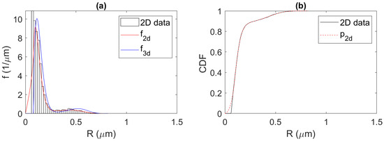(a) Comparison of the measured 2D data with the approximated 2D and 3D particle size distribution functions. The histogram presents the data, whilst the red and blue continuous lines describe the calculated 2D and 3D distribution functions. (b) The cumulative distribution functions comparing the 2D data and the 2D model, with the data described using the continuous black line, and the calculation in the dashed red line.
