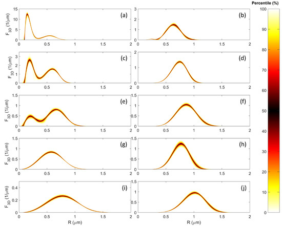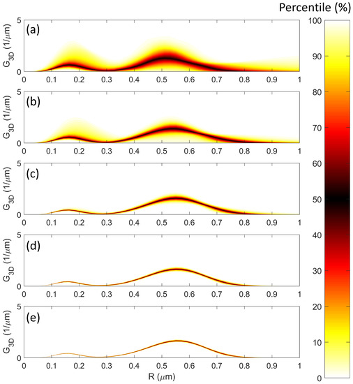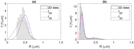 where and refer to the mean particle radius of cross-sections from a monomodal and a polydisperse ensemble, respectively. We can use the normalised probability density describing the particle radius distribution of 3D particles to determine