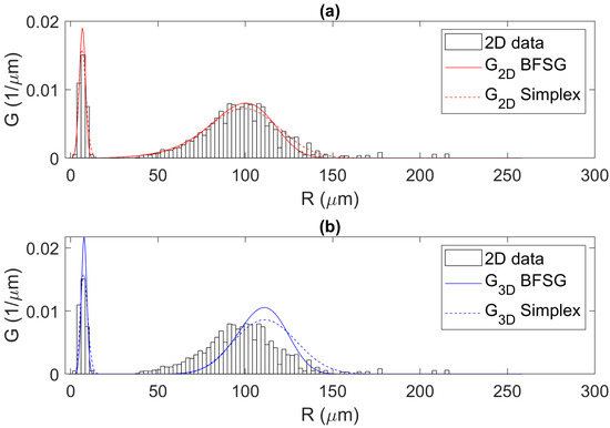 Diogenes et al. [20] presented an optimisation-based procedure to approximate the 3D size of a non-penetrating dispersion of spheres from equivalent radii of circles obtained from a 2D intercept through the dispersion. They randomly cut discretely sampled particles from the approximated 3D distribution to build up a 2D distribution function to compare with the experimental data and explored different expressions to describe the 3D size distribution. They applied a simulated annealing algorithm to optimise the shape parameters to approximate the 3D size distribution.