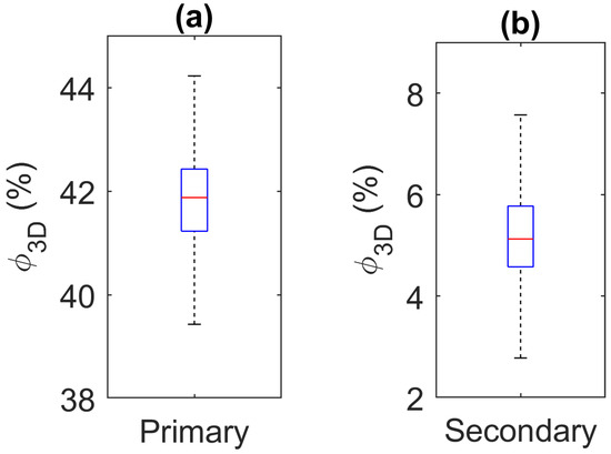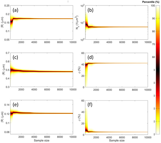 Extreme error and uncertainty is shown for a sample size of 300, which is sometimes used to quantify unimodal distributions. This has a significant impact upon the estimated 3D number concentration, mean size, and volume fraction of the different populations, as shown in Figure 12. Figure 12a,b presents the scatter in predicted 3D mean particle radius and 3D number concentration considering the total distribution. Figure 12c,d present the variation in mean size and volume fraction of the primary particles, and Figure 12e,f show the scatter in mean size and volume fraction for the secondary particles. A sample size of less than 1000 results in unacceptable error in all the statistics examined. A sample size of 3000 particles is a reasonable number of particles; however, it still results in considerable uncertainty in particle volume fraction in the bimodal distribution, as shown in Figure 10, with 5% variation considering the 5th and 95th percentiles.