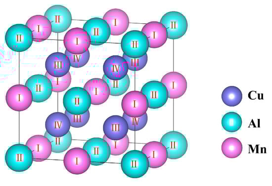 The austenite of Cu-Al-Mn alloy is a highly ordered L21 structure that contains four types of lattice points and its chemical formula is Cu2AlMn []. As shown in Figure 1, Type I and Type II are occupied by Mn and Al atoms respectively, and Type III and Type IV are occupied by Cu atoms. Each of the four types of lattice sites individually forms a face-centered cubic (FCC) lattice.