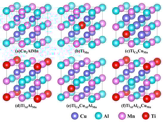 where Etotal represents the total ground-state energy of the unit cell, NX (X = Cu, Al, Mn, Ti) represents the number of corresponding elements X in the cell, and μX (X = Cu, Al, Mn, Ti) represents the average atomic energy of the element X. The calculated formation energy was listed in Table 1. It is known that lower formation energy means that the thermodynamic stability of the compound is higher. As shown in Table 1, the configuration constructed by direct substitution always has the lowest formation energy. Therefore, the configurations constructed by direct substitution were utilized for further calculation.