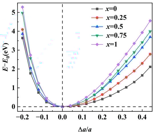 To clarify the effect of Ti on phase stability, tetragonal distortion under the Bain path was applied to L21 lattices of Cu2AlMn1–xTix (x = 0, 0.25, 0.5, 0.75, and 1) alloys. Figure 3 displays the energy changes (E–E0) of the Cu2AlMn1–xTix (x = 0, 0.25, 0.5, 0.75, and 1) alloys under different tetragonal distortions (Δa/a). The L21 phase (Δa/a = 0) always has the lowest total energy for different substitution content of Ti, indicating that the alloys have no transition tendency to martensite. With the increase of Ti substitution content, it can be found that the energy curves near the origin become steeper, which indicates that the L21 phase stability of Cu2AlMn1–xTix alloys increases. This is consistent with the phenomenon that the superelastic effect properties of Cu-Al-Mn-Ti alloys start to deteriorate when the addition of Ti exceeds 4.6wt % [].