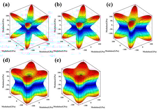 The three-dimensional surface of Young’s modulus anisotropy: (a) Cu2AlMn, (b) Cu2AlMn0.75Ti0.25, (c) Cu2AlMn0.50Ti0.50, (d) Cu2AlMn0.25Ti0.75, and (e) Cu2AlTi.