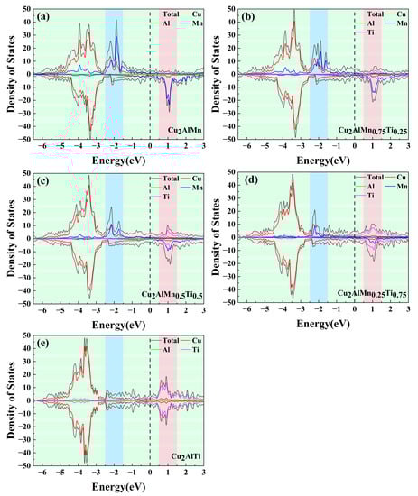 The TDOS of Cu2AlMn1–xTix (x = 0, 0.25, 0.5, 0.75, and 1) near Fermi Energy: (a) Cu2AlMn, (b) Cu2AlMn0.75Ti0.25, (c) Cu2AlMn0.50Ti0.50, (d) Cu2AlMn0.25Ti0.75, and (e) Cu2AlTi. The blue regions indicate that TDOS significantly decreases with the increase of Ti content. The red regions indicate that TDOS significantly increases with the increase of Ti content.