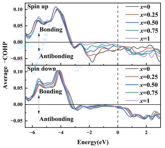 The average –COHP values of Cu2AlMn1–xTix (x = 0, 0.25, 0.5, 0.75, and 1) unit cell near Fermi Energy.