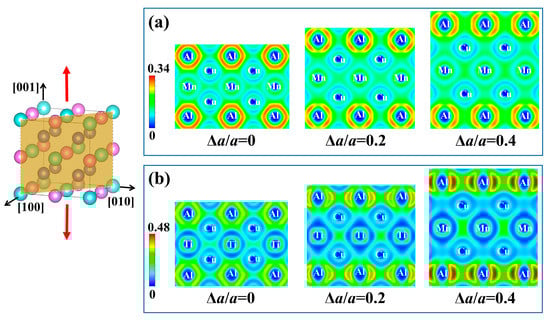 The ELF map of alloys in (110) crystal face: (a) Cu2AlMn, (b) Cu2AlTi. A larger ELF value indicates a relatively higher degree of localization of the electron.