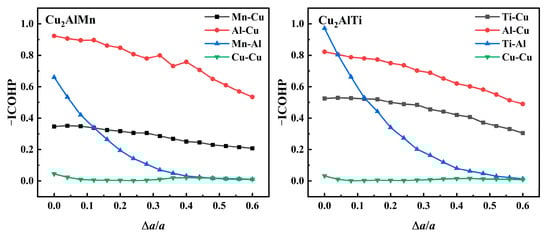 Then, the variation of covalent bonding strength during tetragonal distortion was examined. Figure 7 displays the electron localization function (ELF) maps of Cu2AlMn and Cu2AlTi for tetragonal distortion at different levels. Larger ELF values imply stronger covalent bonds, and these regions are marked in red in Figure 7. As shown in Figure 7, the ELF values between Mn and Al as well as those between Ti and Al decrease rapidly with the increase of tetragonal distortion, which indicates that the covalent bond strength of Al-Mn and Al-Ti is very sensitive to the tetragonal distortion. In order to quantitatively analyze the change of covalent bonding, the −COHP values of Cu-Mn, Cu-Al, Cu-Ti, Al-Mn, Al-Ti, and Cu-Cu bonds were integrated at Fermi energy, as shown in Figure 8. The strength of Al-Mn and Al-Ti covalent bonds declines rapidly in the early stage of the tetragonal distortion process, which is consistent with the previous analysis. However, the strength of Cu-Mn, Cu-Al, and Cu-Ti covalent bonds changes relatively slowly and the strength of Cu-Cu covalent bonds is always very weak. The result indicates that the strength of Al-Mn and Al-Ti covalent bonds is unstable and greatly affected by tetragonal distortion.