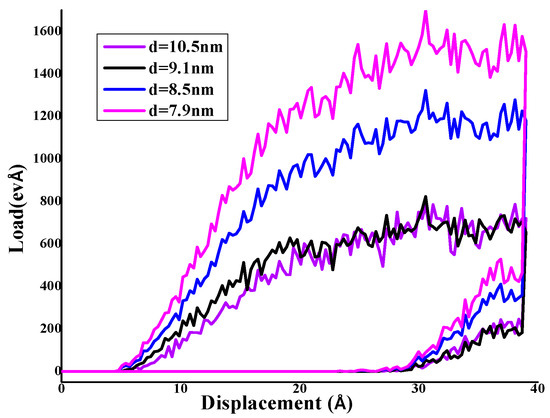 The nanoindentation process involves the use of different grain sizes, namely 7.9 nm, 8.5 nm, 9.1 nm, and 10.5 nm. The dimensions of the box are kept constant at 200 Å × 200 Å × 200 Å as previously mentioned. In addition, the loading rate is fixed at 3 Å/ps, and the temperature is maintained at 300 K for each grain size.