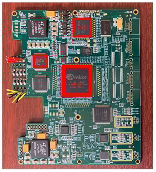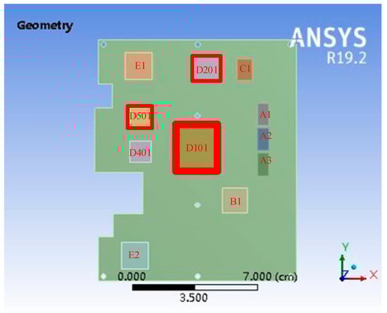 The specimen used in this paper was shown in Figure 1. The PCB was made of Flame Retardant 4 (FR4) with 135 mm × 110 mm × 2 mm. A daisy chain circuit, including two BGA devices (D101 and D201) and one QFP device (D501), was designed and manufactured to be constantly electrically monitored by an event detector and a data logger. Next, 63Sn37Pb, a typical material used widely for airborne applications, was used to assemble those components. The hot air heating method was applied to form the solder joints with a peak temperature of 245 °C. The time above liquidus temperatures was 97 s, preheating was 90 s between 100 °C and 120 °C, temperature rate before preheating was 3 °C/s, and the cooling rate was 3°C/s after melting.