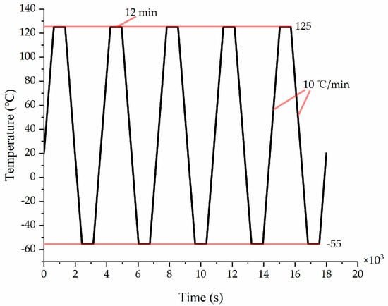A temperature cycling test chamber was used to conduct a thermal cycle test. Figure 2 illustrated the temperature profile for the thermal cycle test. At the beginning of the experiment, the initial temperature was 20 °C, the maximum temperature was 125 °C, and the minimum temperature was −55 °C. Low dwell and high dwell were constant for 12 min, with a ramp of 10 °C per minute.