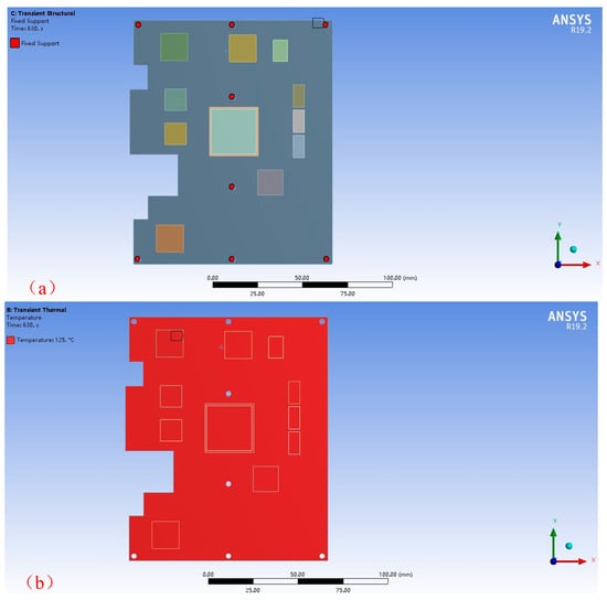 Boundary conditions and loads: (a) the eight corner screw holes with fixed support; (b) temperature loads applied on all the external surface of the specimen.