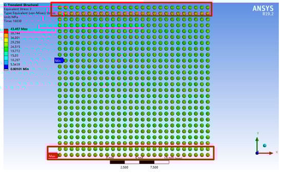 FEM calculated the thermal stress distribution under the thermal cycle test condition. The maximum equivalent stress appeared at the interface of the solder joints and copper electrode in D101. The von-Mises stress distribution during the stable cycle was shown in Figure 8. More stress was distributed along with the outer columns compared with the inner ones for solder joints. The solder joints at the corner were even more critical than the ones during the temperature cycling test. The maximum von-Mises stress was 43.487 MPa and it occurred at the low temperature stage which should be considered as the dangerous solder joint. On the contrary, the equivalent stress was much lower at the high temperature stage. This was because the solder material showed strong viscoplasticity at high temperature, and its deformation resistance and dynamic recovery characteristics were very low, so its thermal stress was very small. Then, the equivalent stress rose sharply as the temperature increased, indicating that the viscoplastic material had a process of re-cooling and hardening during the transition from high temperature to low temperature, resulting in its elastoplasticity decreasing and brittleness increasing.