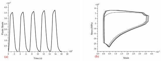 The mechanic response profile: (a) the plastic strain curves of the dangerous solder node, (b) the stress-strain hysteresis loop of the dangerous solder node.