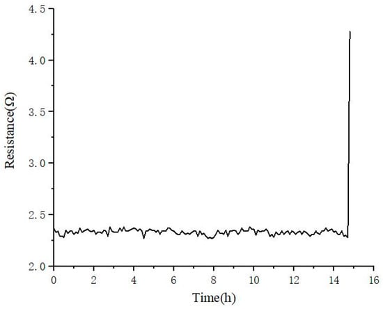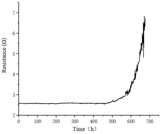 The lifetime distribution of the temperature cycling was listed in Table 7. The average lifetime of the 16 specimens was 525.5 h with a standard deviation of 40.4. There were almost no specimens with early failure, and the failure time was relatively concentrated. The fatigue life for temperature cycling was 589 h based on the test results. Experimental results accorded well with the simulation results. All specimens failed due to the increase in daisy chain resistance, and there was no open circuit phenomenon for the temperature cycling test. The resistance of the daisy chain circuit of specimen 16A as the function of time for the temperature cycling tests was shown in Figure 12. It could be seen that the resistance of the daisy chain increased gradually with time. The thermal fatigue crack propagation behavior caused the value of resistance to increase apparently with time.