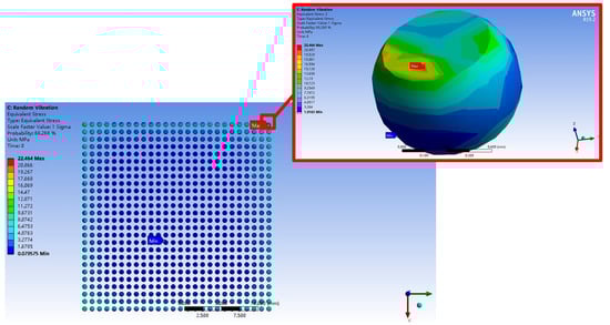 Using modal analysis, the natural frequencies of orders 1–6 were obtained, as shown in Table 8. Based on Steinberg’s three-band theory, the node displacement under random vibration is subject to a Gaussian distribution. Within the ±1σ, ±2σ and ±3σ distribution interval, the probability of instantaneous acceleration was 68.3%, 95.4% and 99.7%, respectively. The distribution of equivalent stress of 1σ in D101 was shown in Figure 13. The maximum stress was 22.464 MPa at the corner and the probability of occurrence was 68.3% under the random vibration.