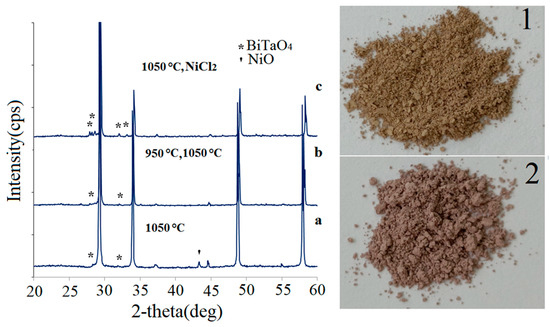 X-ray powder diffraction patterns of Bi2NiTa2O9 samples synthesized from BiTaO4 and NiO in one stage at 1050 °C (a) and in two stages at 950 and 1050 °C (b), using the NiCl2 precursor (c); photographs of Bi2NiTa2O9 samples synthesized from (1) NiCl2 and (2) oxides.