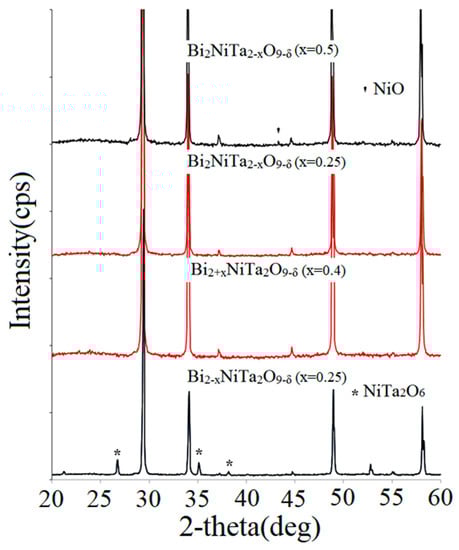 First of all, the influence of bismuth and tantalum composition non-stoichiometry on the phase composition of ceramics was investigated on the examples of Bi2−xNiTa2O9−δ, Bi2+xNiTa2O9+δ, and Bi2NiTa2−xO9−δ (x ≤ 0.5) compounds. X-ray powder diffraction patterns of the samples are shown in Figure 2. According to the X-ray powder diffraction phase analysis data, the Bi2−xNiTa2O9−δ samples are non-phase pure even at x = 0.25. The X-ray powder diffraction patterns of the samples demonstrate reflexes of a single impurity NiTa2O6 (sp. gr. P-1). The formation of the nickel tantalate impurity can be explained by the fact that the bismuth sublattice is significantly unfilled, by 42% and 50%, respectively. These values, as will be shown later, are above the bismuth sublattice defectivity limit for pyrochlore stabilization. In the case of Bi2+xNiTa2O9+δ compositions, the sample at x = 0.4 is single-phase. Based on this, one can conclude that the minimum vacancy limit of the bismuth sublattice is likely to be 20%. Thus, the allowable range of bismuth sublattice vacancy is about 20–33%.