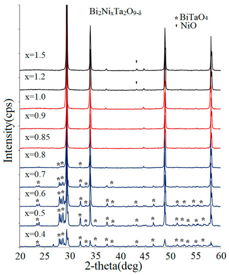 X-ray powder diffraction patterns of Bi2NixTa2O9−δ (0.4 ≤ x ≤ 1.2) samples.