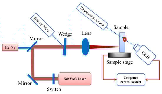 The laser induced damage threshold measurement system is shown in Figure 1. A 6.8 ns, 10 Hz, 355 nm Nd: YAG laser is employed in the experiment. The laser spot is near Gaussian distribution with a 0.8 mm2 laser spot area. The laser fluence was adjusted by an energy attenuator consisting of a half-wave plate and a polarizer. A He–Ne laser and a CCD camera are employed to detect the initial damage of laser action area in real time. An energy meter is used to measure the output laser energy separated from the wedged split plate with the maximum measurement energy range of 50 mJ. When the initial laser damage occurs, light scattering signals derive from the damaged sites in the surface of sample. These signals are caught by a scientific grade CCD camera coupled with a 3 times magnification objective lens. The illumination source is transmissive, which can make the CCD camera on the back surface of the sample observe the laser damage area more clearly.