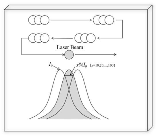 To form a nearly uniform laser fluence on the SiO2 sol-gel antireflection film, laser conditioning was performed by raster scanning method. The laser conditioning process with raster scanning method also adopts the optical system, as shown in Figure 1. During raster scanning process, the spatial pulse-to-pulse overlap of x and y directions were set to 50% by adjusting the sample moving speed. The scanning frequency was 10 Hz. In order to determine a suitable combination of laser parameters, 1-on-1 method was used to test the damage probability of the film without laser conditioning. The 1-on-1 test measured the single-pulse LIDT by exposing each testing site to one laser pulse, and the zero-damage threshold were defined as the zero-probability damage threshold. The zero-damage threshold (Fth0) was obtained by linear fitting from damage probability curves, and 0.1 n Fth0 (n = 1, 2, 3…) was used as the incremental energy (n selected according to the design). Finally, the sample surface was scanned by the raster scanning mode, as shown in Figure 2. After laser conditioning, the laser induced damage threshold measurement was performed immediately, and at least three different damage probabilities were tested during the experiment. The test points of each damage probability were no less than 20, and the damage probability curves under different conditions were drawn. In order to make the experiment more comparative, the damage threshold was converted into laser energy at 3 ns.