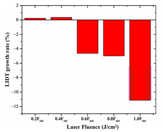 Based on the description of Section 2.2 in this paper, the zero-damage threshold Fth0 of the SiO2 sol-gel antireflection film without laser conditioning was obtained by 1-on-1 damage testing and linear fitting (the zero damage threshold of the film without laser conditioning was 8.04 J/cm2 in the experiment). Then, different regions of the same sample were treated with 0.2 Fth0, 0.4 Fth0, 0.6 Fth0, 0.8 Fth0, and 1.0 Fth0 laser fluence, respectively. After laser conditioning, the zero-damage threshold Fth0 by 1-on-1 damage testing and linear fitting was measured, respectively, and compared with the SiO2 sol-gel antireflection film without laser conditioning. The result is shown in Figure 3. It can be seen from Figure 3 that in a single-step laser conditioning region of SiO2 sol-gel antireflection film, the zero-damage threshold drops rapidly when the laser fluence in the treated region reaches or exceeds 0.6 Fth0. Only when the laser fluence is lower than 0.6 Fth0 is there a certain laser conditioning effect, but the laser induced damage threshold is not significantly improved. As shown in Figure 3, the LIDT growth rates of the SiO2 sol-gel antireflection film treated with 0.2 Fth0 and 0.4 Fth0 were 0.24% and 0.36%, respectively. Such small LIDT growth rates may be annihilated in the test error, and, obviously, they were impossible to have the engineering significance of improving the laser damage resistance of SiO2 sol-gel antireflection film. Therefore, the experiment shows that the single-step energy laser conditioning process does not have the effect of improving the laser damage resistance characteristics of SiO2 sol-gel antireflection film. If the laser fluence is too high, it is easy to greatly reduce the laser damage threshold of optical film, which has the opposite effect.