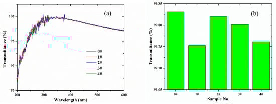 We carried out the transmission characterization experiment on the ultraviolet—visible spectrophotometer. Figure 4a reflects the changes of transmittance of sample 0#–4# with wavelength. It is not clear how to reflect the influence of laser conditioning on the transmissivity of the film through Figure 4a, due to the small film transmittance change. Thus, the transmittance corresponding to the wavelength of 351 nm is extracted, and the histogram is used to reflect the change of transmittance. As shown in Figure 4b, the transmittance of sample 1# is 99.75%. Compared with the as-grown coating (sample 0#), the transmittance decrease rate of sample 1# reaches 0.8‰, while the transmittance decrease rate of other samples is below 0.7‰. It is shown that the transmittance of the samples almost no obvious change after multi-step laser conditioning process.