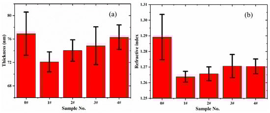 Figure 5b shows that the change of refractive index after laser conditioning is consistent with the change of film thickness. The refractive index of SiO2 sol-gel antireflection film measured in our experiment exceeds 1.26. The main reason is that when we measure the refractive index of coating with an ellipsometer, the coating substrate is fused silica. However, the fused silica substrate itself is transparent, and the refractive index difference between the fused silica substrate and the coating is not very large. It will lead to a high refractive index measured by all samples. The results show that the compactness of the film increases, but the refractive index decreases. According to the refraction index Formula (2):