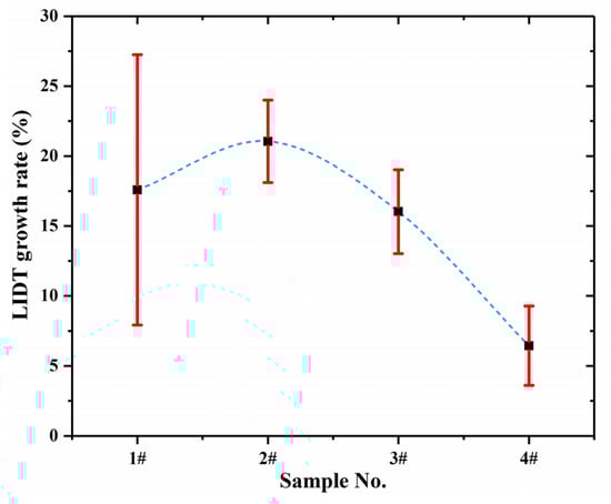 Based on the description of Section 2.2 in this paper, the zero-damage threshold Fth0 of the SiO2 sol-gel antireflection film without laser conditioning was obtained by 1-on-1 damage testing and linear fitting. Then, laser conditioning was performed on different regions of the same sample through the laser conditioning process parameters shown in Table 1. In order to avoid individual fluctuation and test error, we carried out four experiments (corresponding to four samples). In each experiment, the same sample was used. Additionally, the laser conditioning process with different treatment parameters of 1#–4# was carried out for different areas on the surface of the same sample. Figure 6 shows the LIDT growth rate of sample 1#–4# (compared to sample 0#). The error bar reflects the fluctuation of the LIDT growth rate affected by the laser conditioning process.
