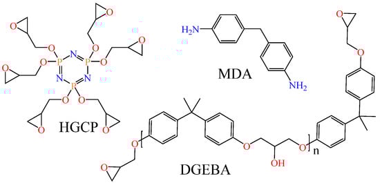 In this study, properties such as bulk density, Tg, Young’s modulus, and thermal conductivity of DGEBA@HGCP@MDA, HGCP@MDA, as well as DGEBA@MDA materials were analyzed by molecular dynamics. We investigated bisphenol-A epoxy resin diglycidyl ether (DGEBA) type Epon 828 and cyclotriphosphazene hexaglycidyl (HGCP) as epoxy resins and 4,4′-methylene dianiline (MDA) as a curing agent (Figure 1). According to the literature report, the HGCP resin synthesis process has been developed [23,24,25].