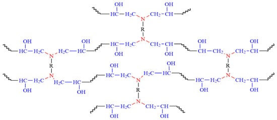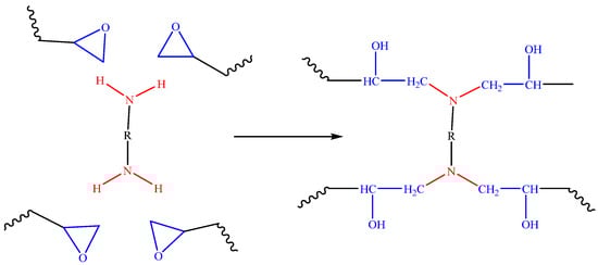 The primary amine initially reacts and links with the epoxide group resulting in a secondary amine. Then, the latter reacts further with the epoxide group. The hydroxyl formed proceeds to react with the epoxide group until a three-dimensional network is formed (Figure 3) [30].