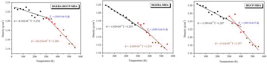 From the density vs. temperature slopes, Tgs were defined as the temperature corresponding to the points of gradient changes. The Tg values of HGCP@MDA and DGEBA@MDA obtained were 365.9 K and 389.3 K, respectively, and these values are far greater than that of DGEBA@HGCP@MDA (313 K), indicating that thermosets made of DGEBA and HGCP exhibited good heat resistance [12,23,24,37].