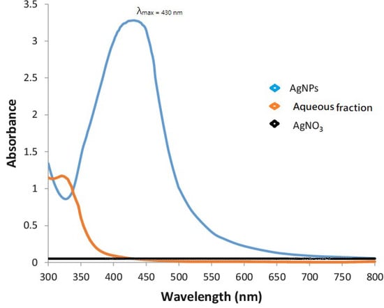 Upon UV-Visible spectroscopy, AgNPs characteristic peak was obtained at 430 nm, whereas silver nitrate and aqueous fraction did not show any characteristic peaks, as shown in Figure 1.