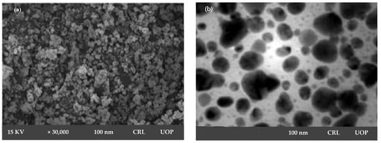 SEM micrograph confirmed mono-dispersed and irregular morphology of AgNPs, with 100 nm particle size at a magnification of 30,000×. SEM declared Sterculia diversifolia aqueous extract as a strong reducing agent and resulted in irregularly shaped AgNPs, as shown in Figure 2a.