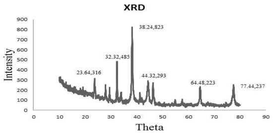 XRD spectrum revealed that the sample was a finely grounded and homogenized substance. Similarly, XRD analysis declared the crystal-like nature of AgNPs (Figure 3). A total of 4 distinct diffraction peaks obtained at 2θ values of 38.24, 44.32, 64.48, and 77.44 could be indexed to the (823), (293), (223), and (337) reflection planes of cubic structure. Additional peaks other than Bragg peaks were observed at 23.64 and 32.32 θ, which were indicative of organic contaminants.