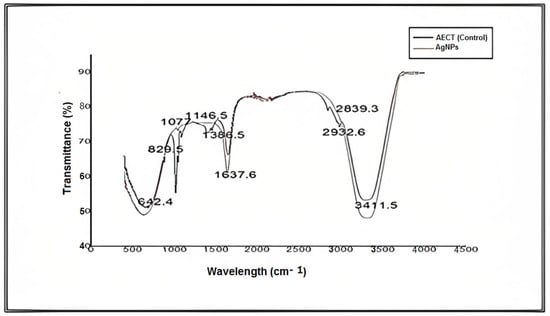 For further characterization, FTIR analysis of an aqueous extract of S. diversifolia and synthesized AgNPs was carried out, and different peaks of the FTIR spectrum were compared, representing amines, carboxylic acids, and alkanes. These imperative functional groups are vital for the synthesis, capping, and stabilization of AgNPs. Peaks in the FTIR spectrum of aqueous extract of S. diversifolia (control) at 3411.5, 2932.6, 1749, 1637.6, 1386.5, 1146.5, 1077, 829.5, and 642.4 cm−1 showed interrelation of different functional groups such as alcohol, alkanes, ester, amide, alkanes, carboxylic acid, aliphatic amines, or phenol and amines, respectively. After reacting with silver nitrate, the new peaks were detected at 3420.8, 2927.7, 1742.9, 1626, 1383.3, 1141.1, 1076.3, 824.5, and 651.3 cm−1, indicating carboxylic, hydroxyl, and amide groups within the aqueous extract of S. diversifolia, which played a role in the synthesis of AgNPs, as shown in Figure 4.