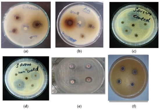 A stock solution of AgNPs (20 μg/μL) was prepared by dissolving 20 mg of AgNPs residue per mL of distilled water. A total of 5 μL (100 μg AgNPs) from the stock solution was poured on antibiotic discs within Petri plates and then allowed to dry at 50 °C for 20 min. The method of AgNPs coating was repeated for each type of antibiotic disc [].
